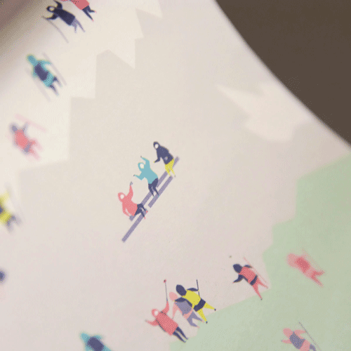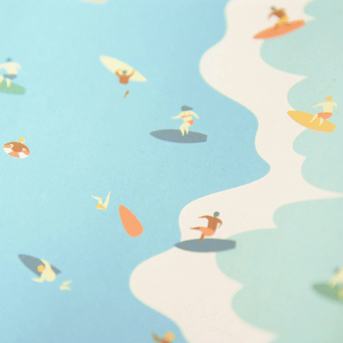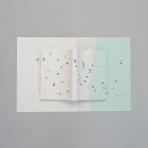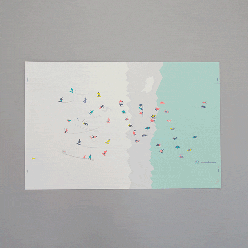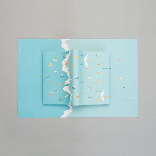 本を伏せるとあらわれる小さな山と波を、のぼったりサーフィンしたりと、思い思いに楽しむ姿が見る人を和ませてくれる文庫用ブックカバー。